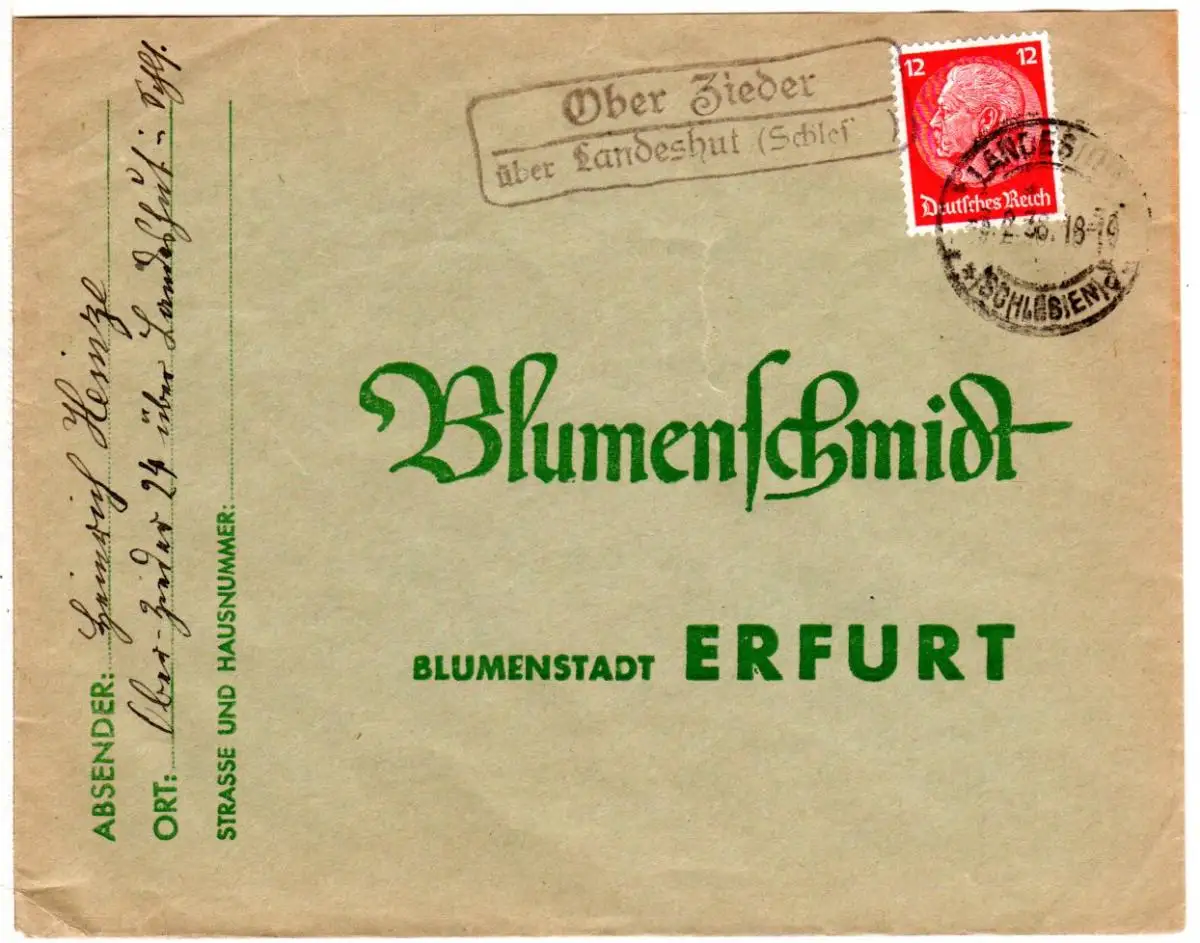 DR 1938, Landpost Stpl. OBER ZIEDER über Landeshut (Schles) auf Brief m. 12 Pfg.