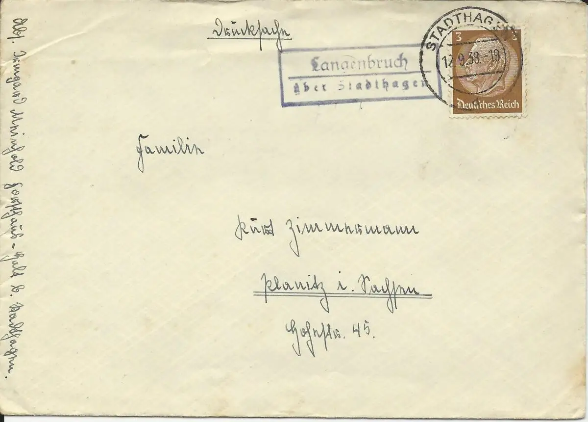 DR 1938, Langenbruch über Stadthagen, Landpost Stpl. auf Brief m. 3 Pf.