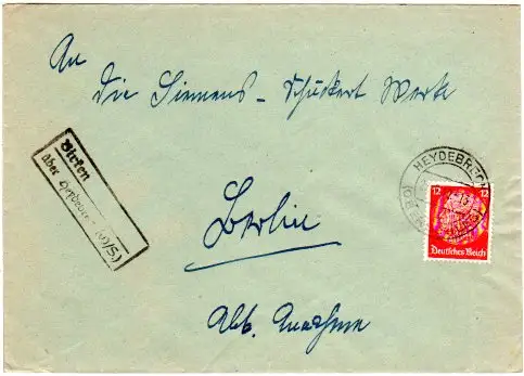 DR 1940, Landpost Stpl. BIRKEN über Heydebreck auf Brief m. 12 Pf.