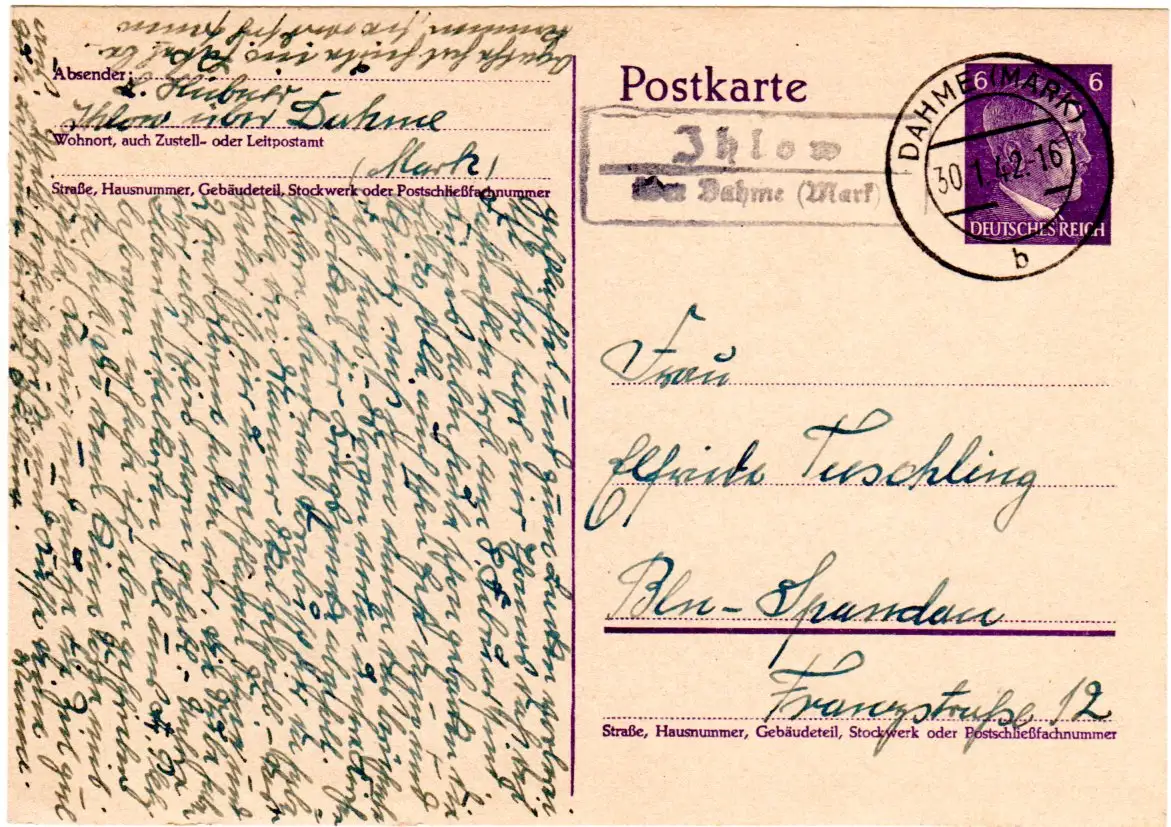 DR 1942, Landpost Stpl. Jhlow über Dahme (Mark) auf 6 Pf. Ganzsache