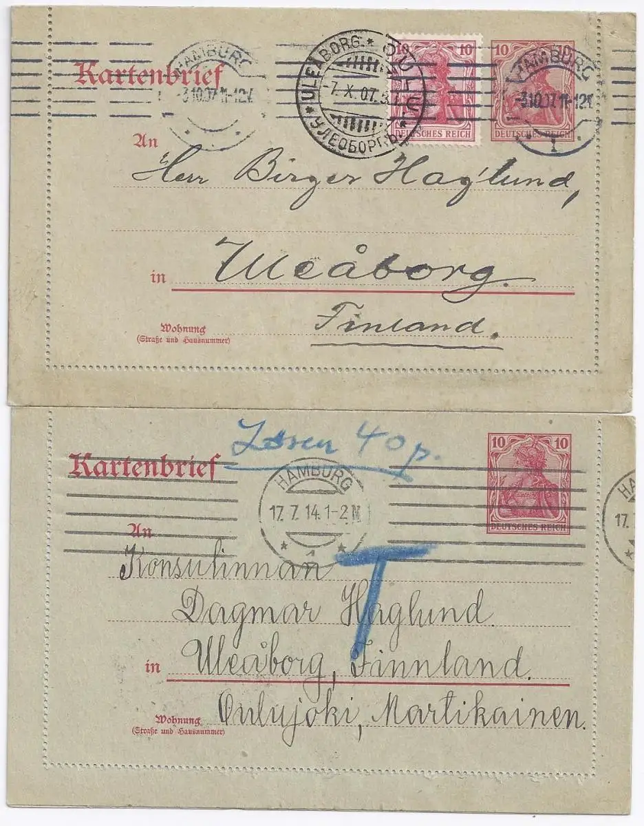 DR Finnland, 2 Karten Briefe v. Hamburg,1mal mit Porto 40 Penni. #318