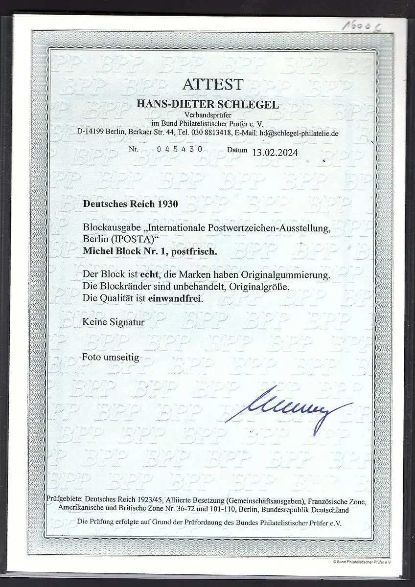 DR., IPOSTA Mi.-Nr. Block 1 postfrisch, FA. SchlegelBPP.