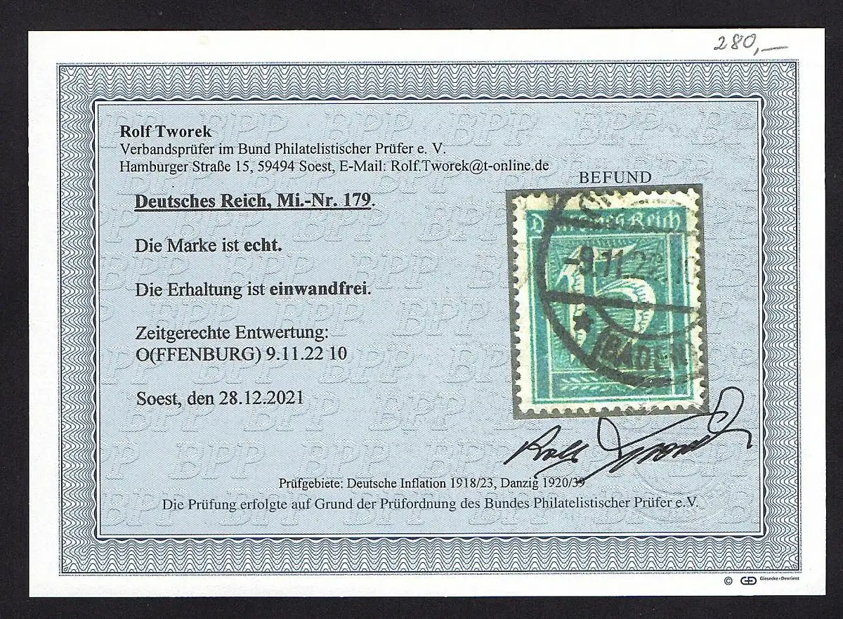 DR., Mi.-Nr. 179, gestempelt, Befund TworekBPP.