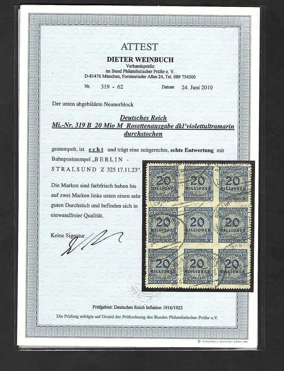 DR, Mi.-Nr. 319 B, 9er Block gestempelt, FA. WeinbuchBPP.