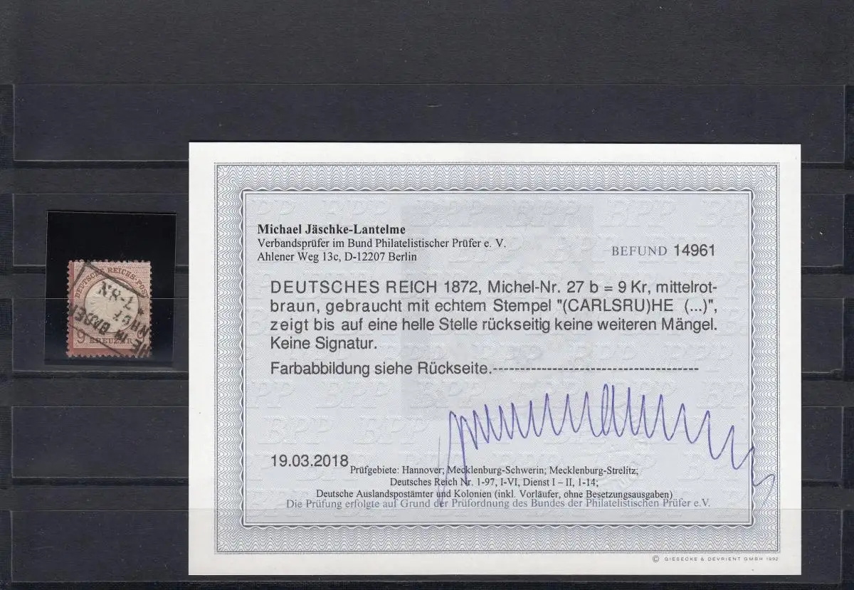 DR: MiNr. 27b, gestempel Carlsruhe, BPP Befund