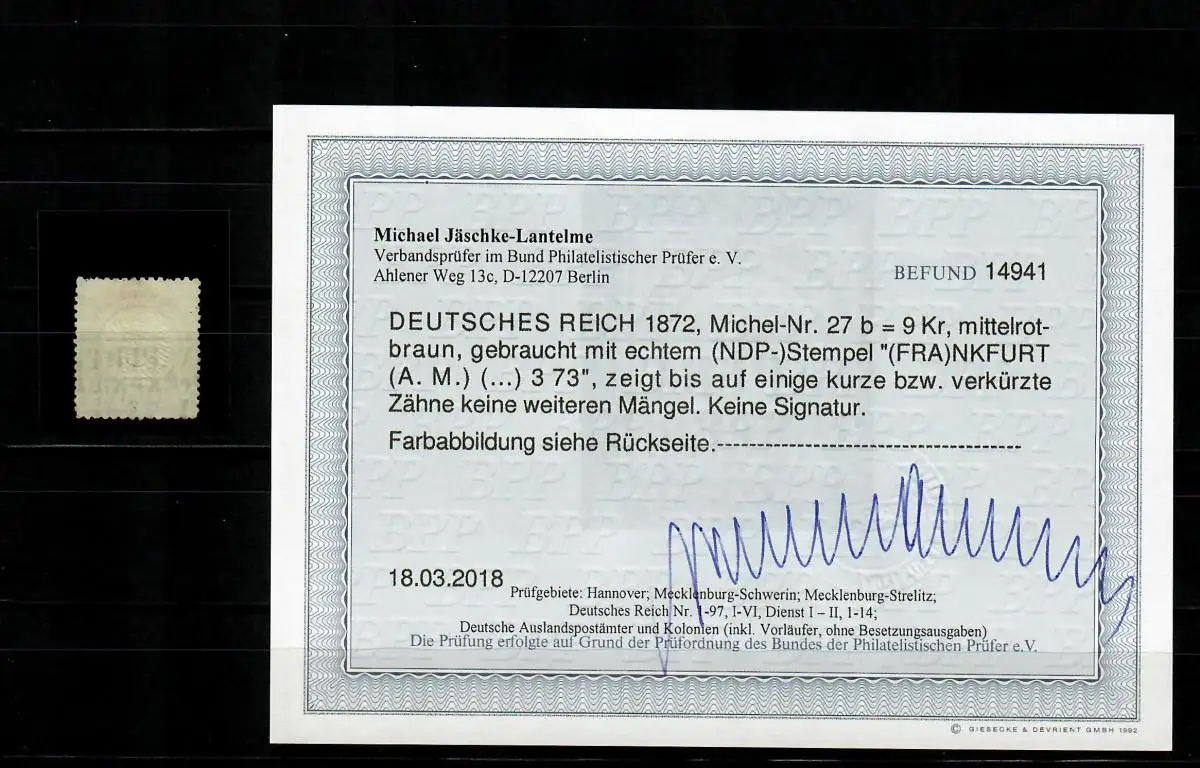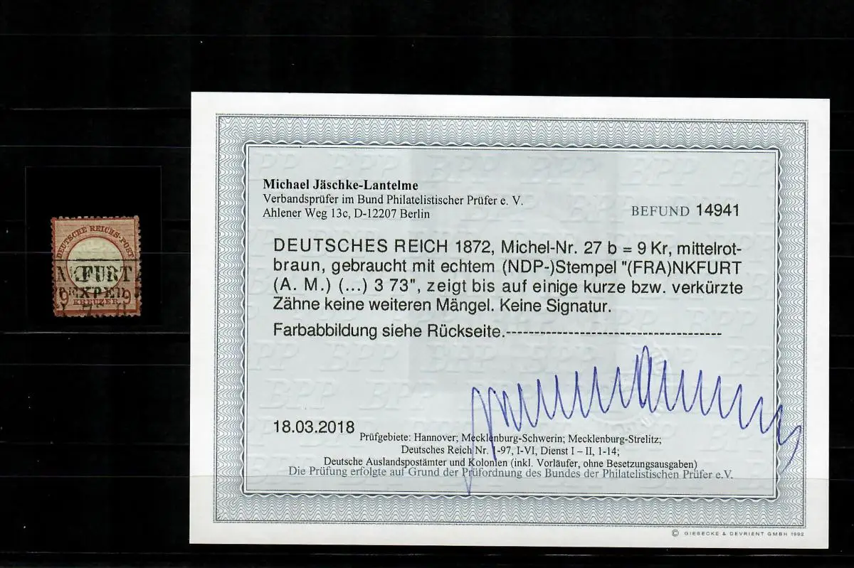 DR: MiNr. 27b, gestempelt Frankfurt, BPP Befund