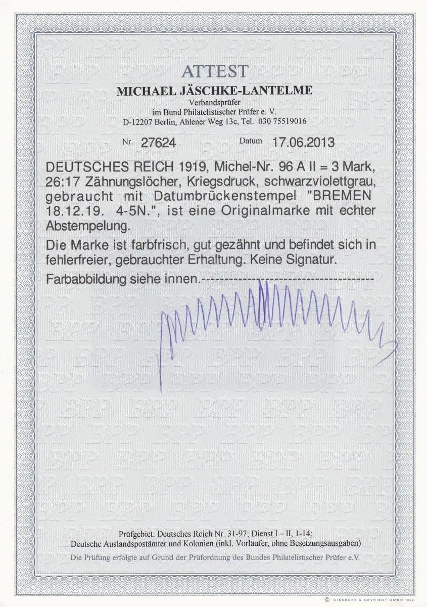 DR: MiNr. 96 A II, gestempelt Bremen 1919, BPP Attest