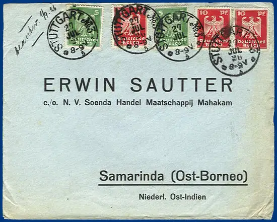 DR NL Indien 1926, Brief Stuttgart Borneo m. Porto 40 Pf. (2. Gew.Stufe). #1458
