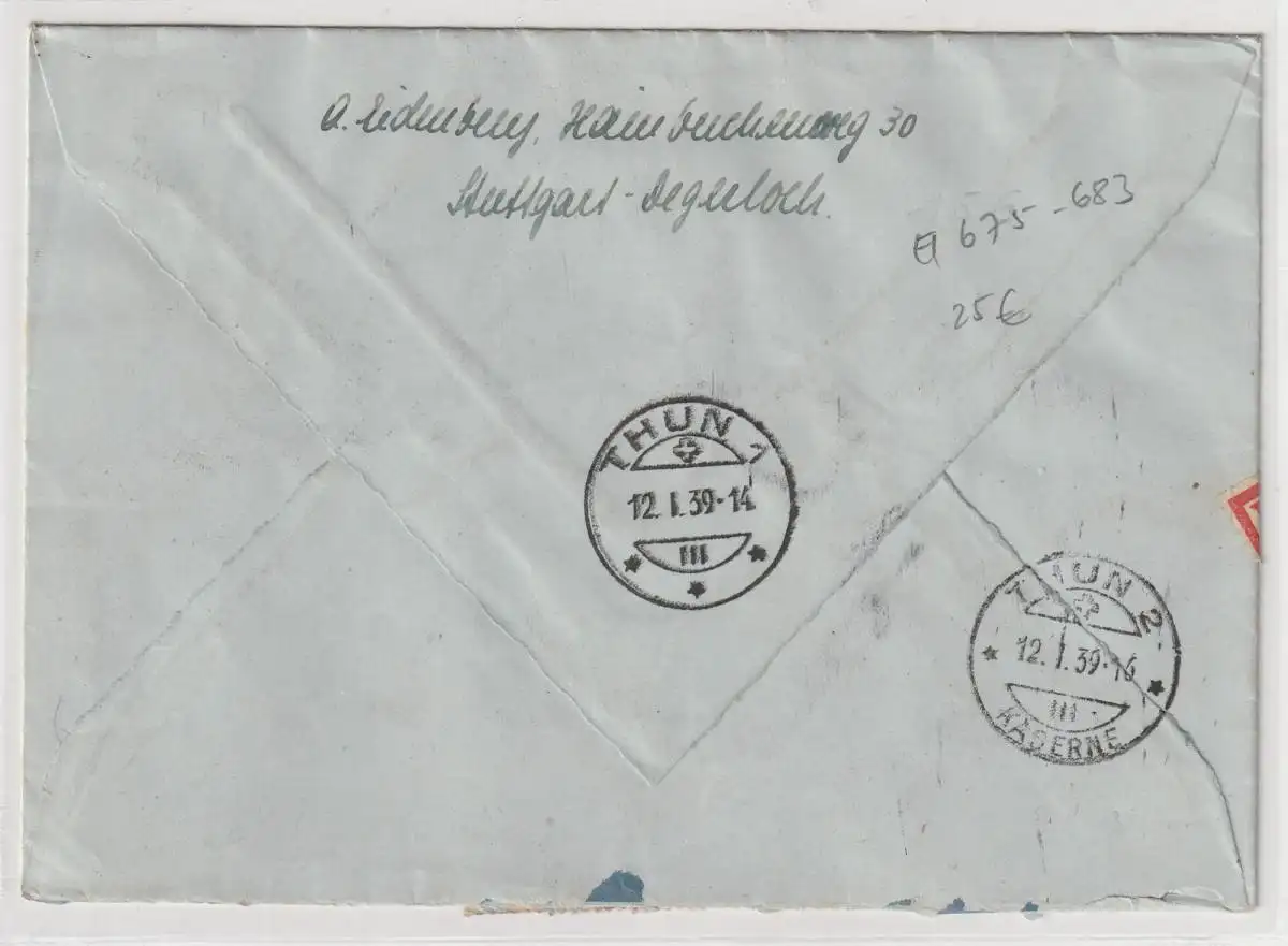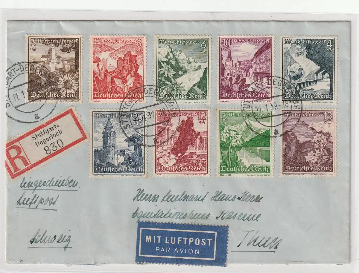Sehr gute Erhaltung. Umschlag wurde unten geöffnet, daher unten kleine Verletzungen. Rückseitig Ank.-stempel. Als Einschreibbrief in die Schweiz gelaufen