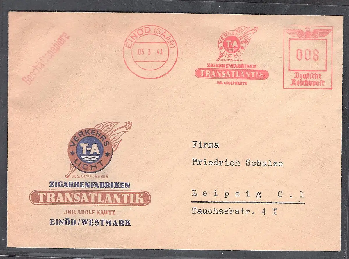 DR. Reklamebrief Zigarrenfabriken Transatlantik Einöd/Westmark. mit AFS.