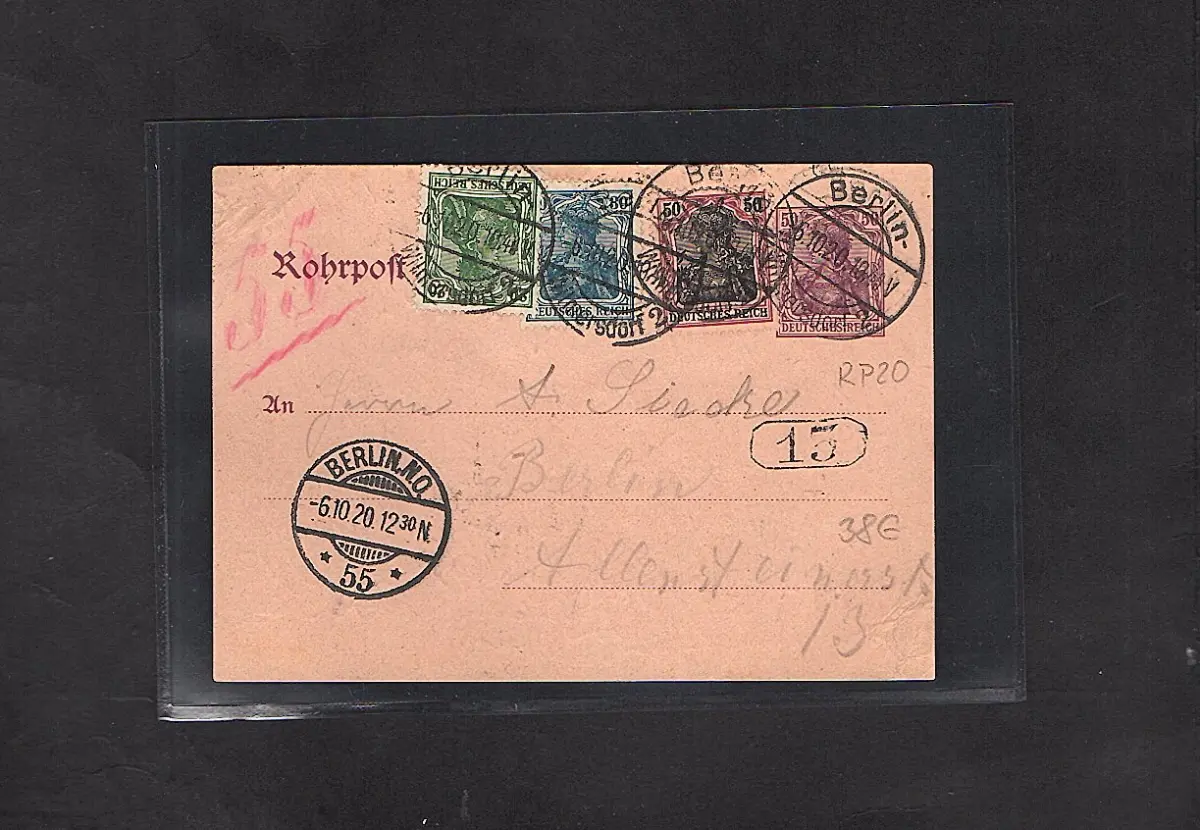 DR. Rohrpost Ganzsache-Karte Rp 20 mit zusatzfrankatur gelaufen