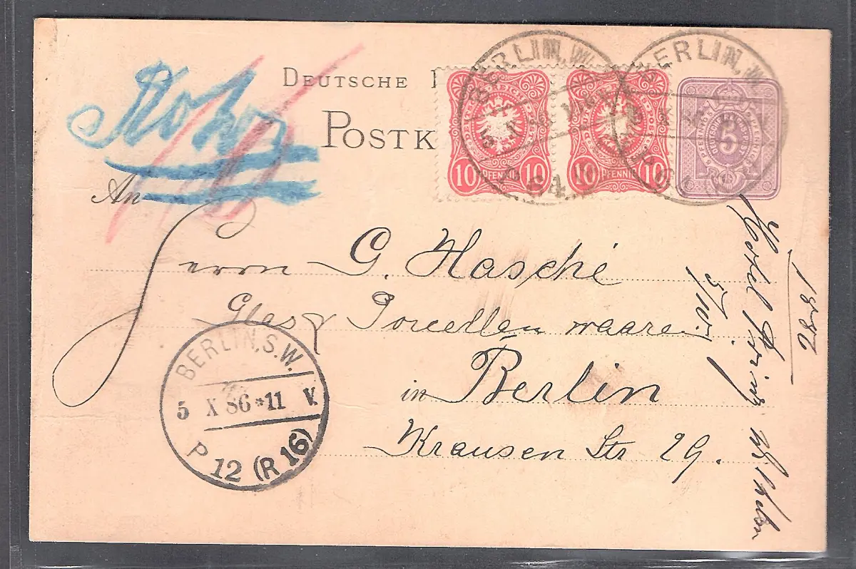 DR. Rohrpost Ganzsache-Karte + ZuF. Berlin 1886 gelaufen