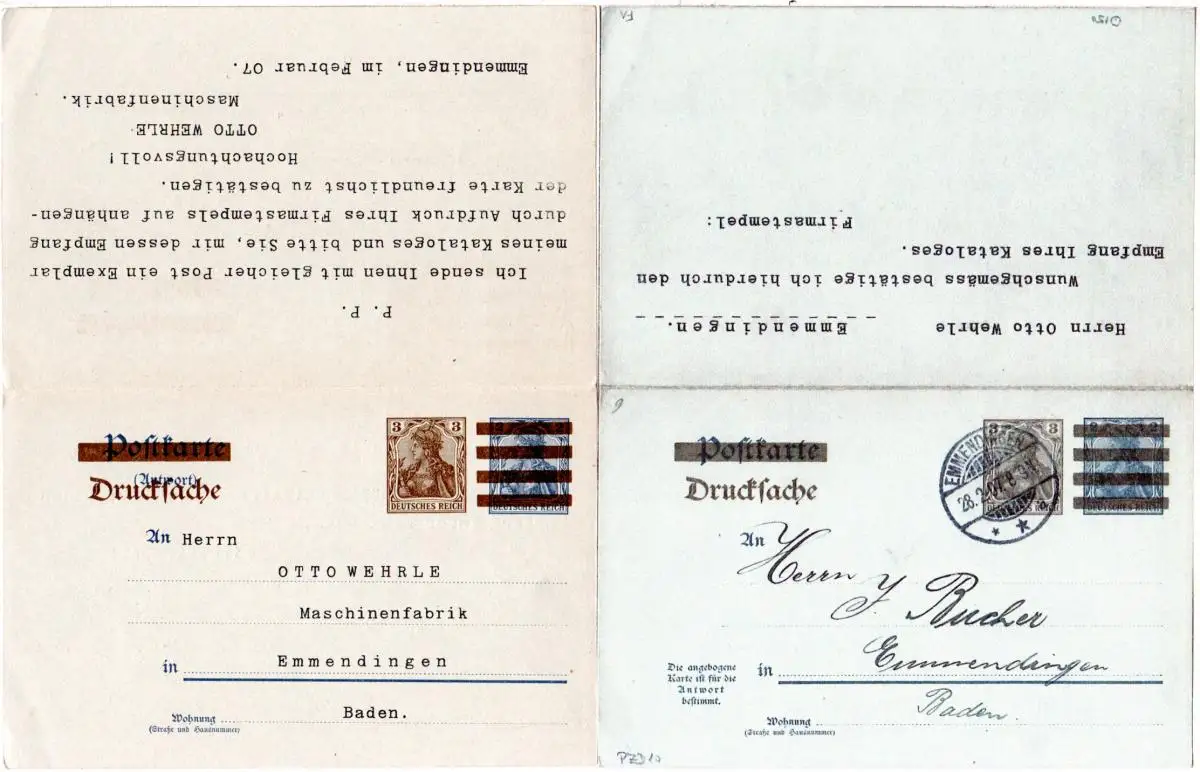 In Emmendingen ortsverwendete 3 neben durchbalkter 2 Pf. Germania Drucksache Ganzsache m. Zudruck Maschinenfabrik Otto Wehrle. Antwortteil ungebraucht.