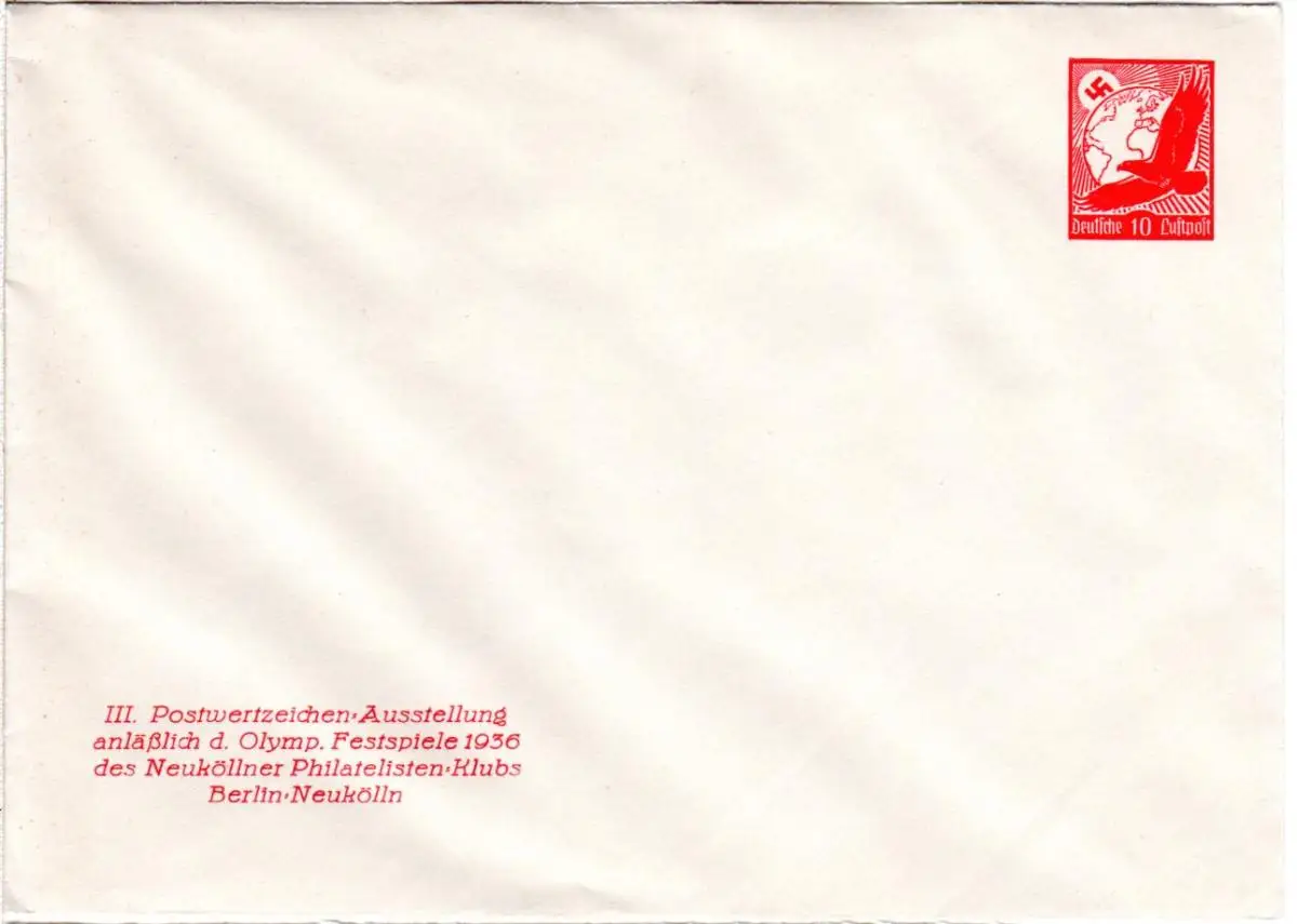 Ungebr. Privatganzsachenumschlag zur III. Postwertzeichenausstellung anlässlich d. Olymp. Festspiele 1936 des Neuköllner Philatelisten-Klubs Berlin-Neukölln.
