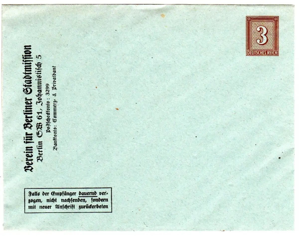 Sauber ungebrauchter Privatganzsachenumschlag Verein für Berliner Stadtmission (blaugraues Papier).