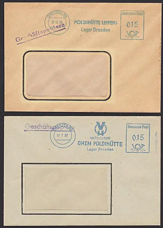 DRESDEN N6 Poldihütte Leipzig, Lager Dresden 2 versch. Werbeteile Dienstpost 1957, 1958
