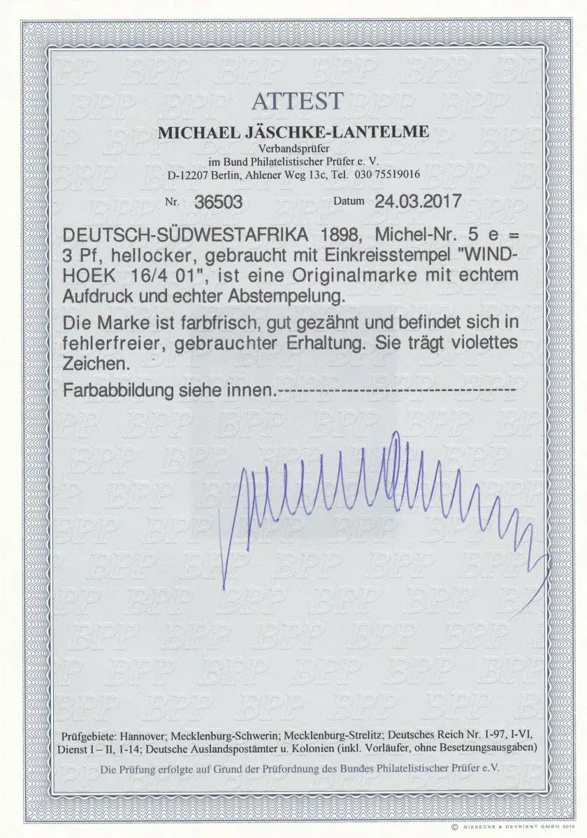 DSWA: MiNr. 5e, gestempelt, BPP Attest