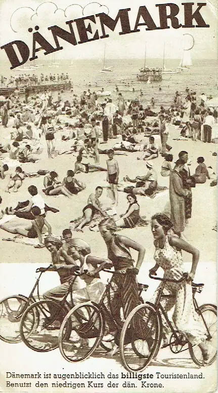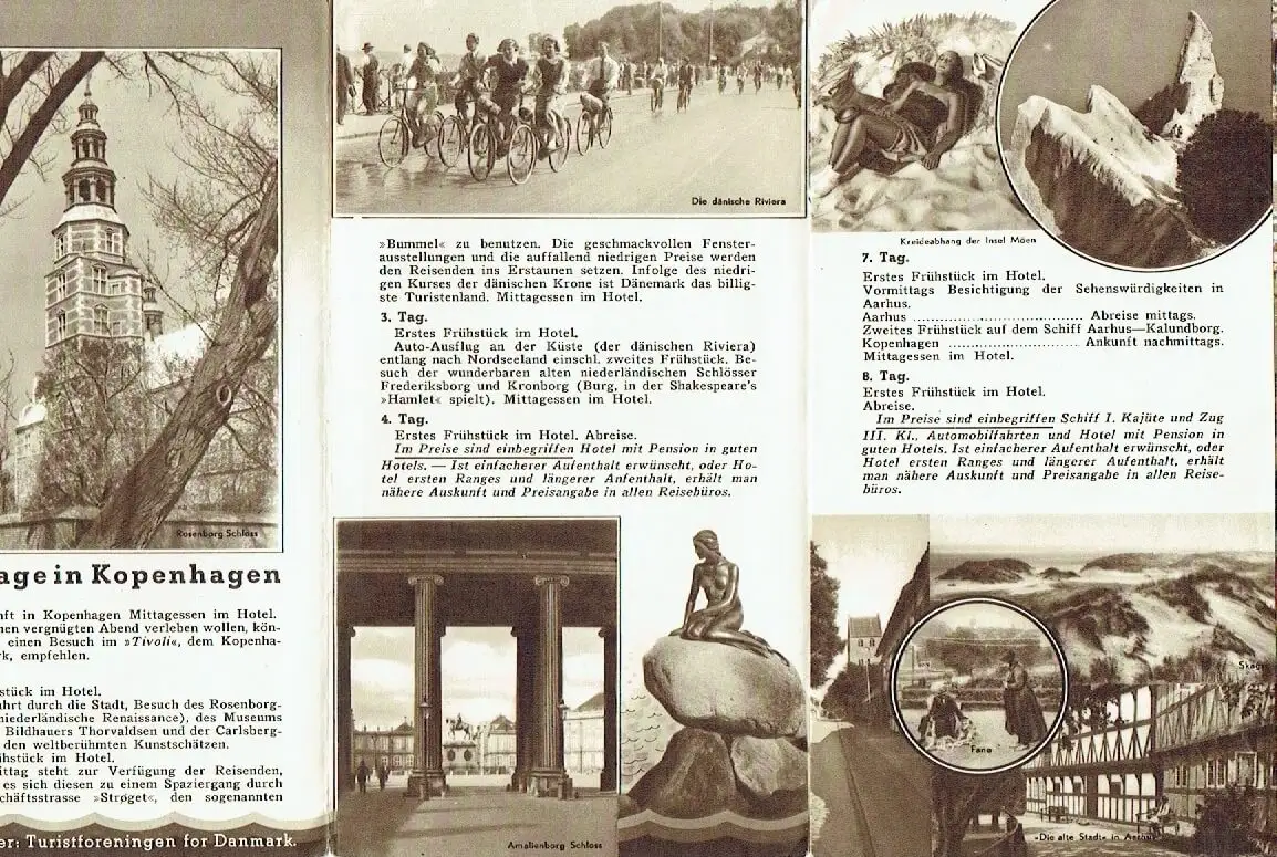 guter Zustand, geringe Gebrauchs- und Alterungsspuren: teils etwas eselsohrig - Außenfalze gering eingerissen - Rückseite mit altem Reisebürostempel, Drei Tage Kopenhagen - 7 Tage durch Dänemark - 3 Tage auf Bornholm - 3 Tage nach Lolland-Falster, Papier, ca. 10,5 x 20, 10 Seiten mit einigen Bildern