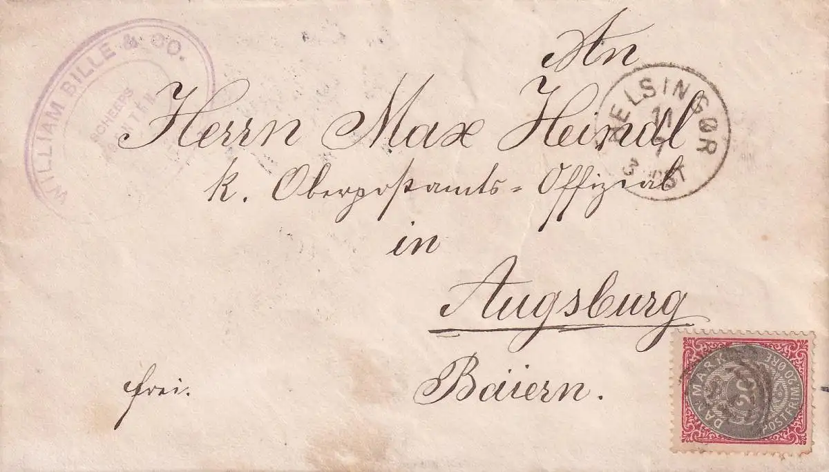 DÄNEMARK 1875 20 Ö/ Mi 28 BRIEFHÜLLE HELSINGÖR (NS 24) nach AUGSBURG/ BAYERN