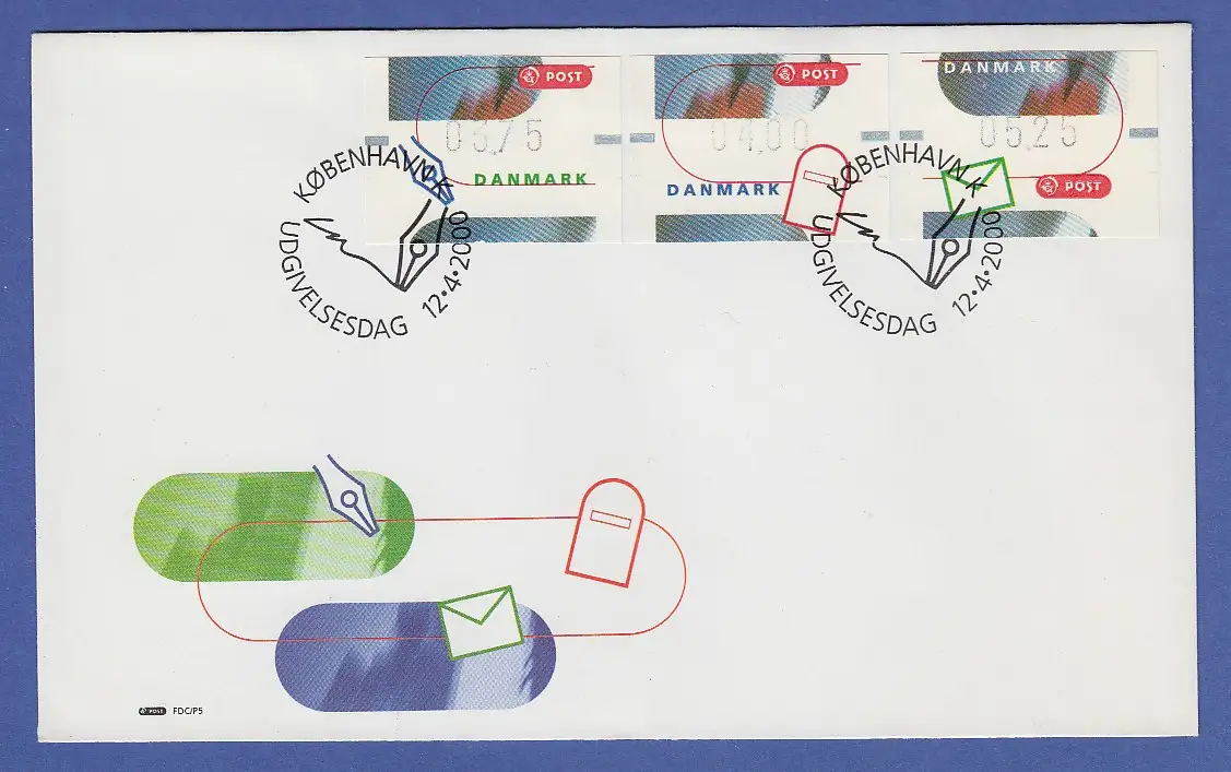 Dänemark ATM Kampagne Briefeschreiben, 3 Motive auf offiz. FDC 12.4.2000