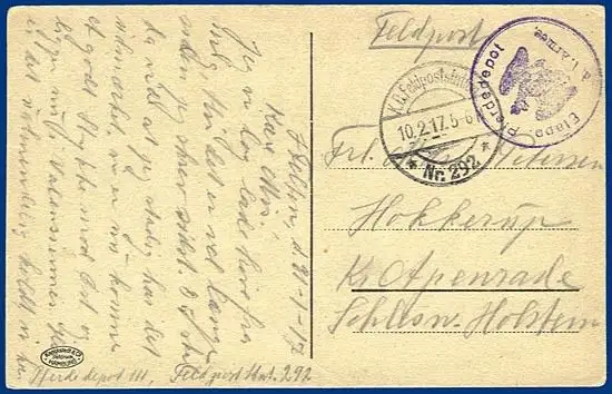 1917, Feldpostkarte K.D.Feldpoststation *Nr.292* und Briefstempel Etapp. Pferdedepot d.1.Armee.. Geschrieben in dänischer Sprache u. nach Hokkerup Kr. Apenrade, Schleswig-Holstein adressiert.