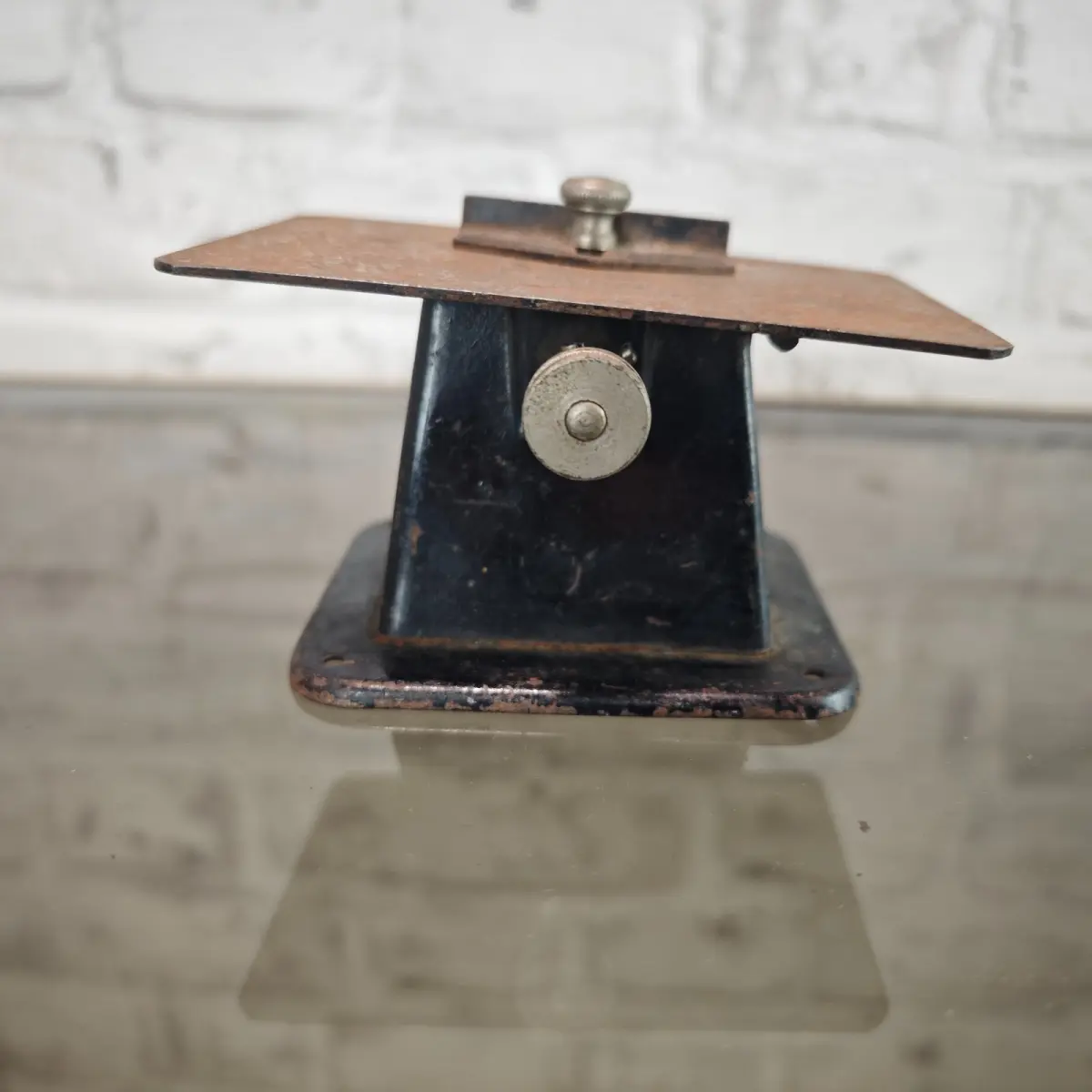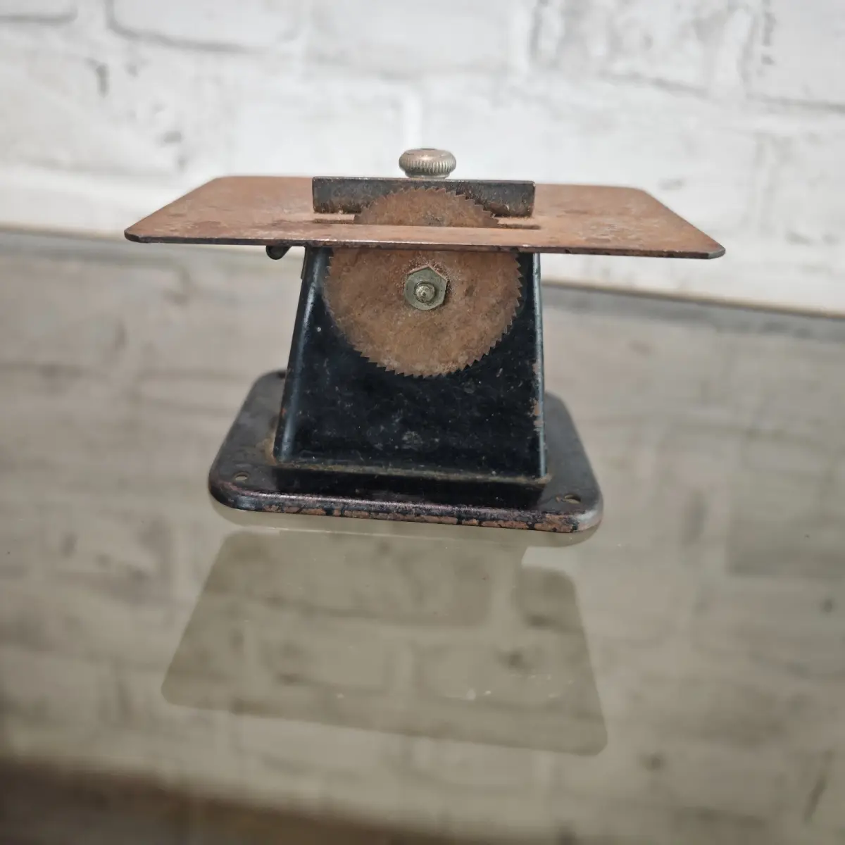 Der Tisch zeigt altersbedingte Rostspuren und Gebrauchsspuren, die Mechanik ist unbehandelt im originalen Fundzustand.