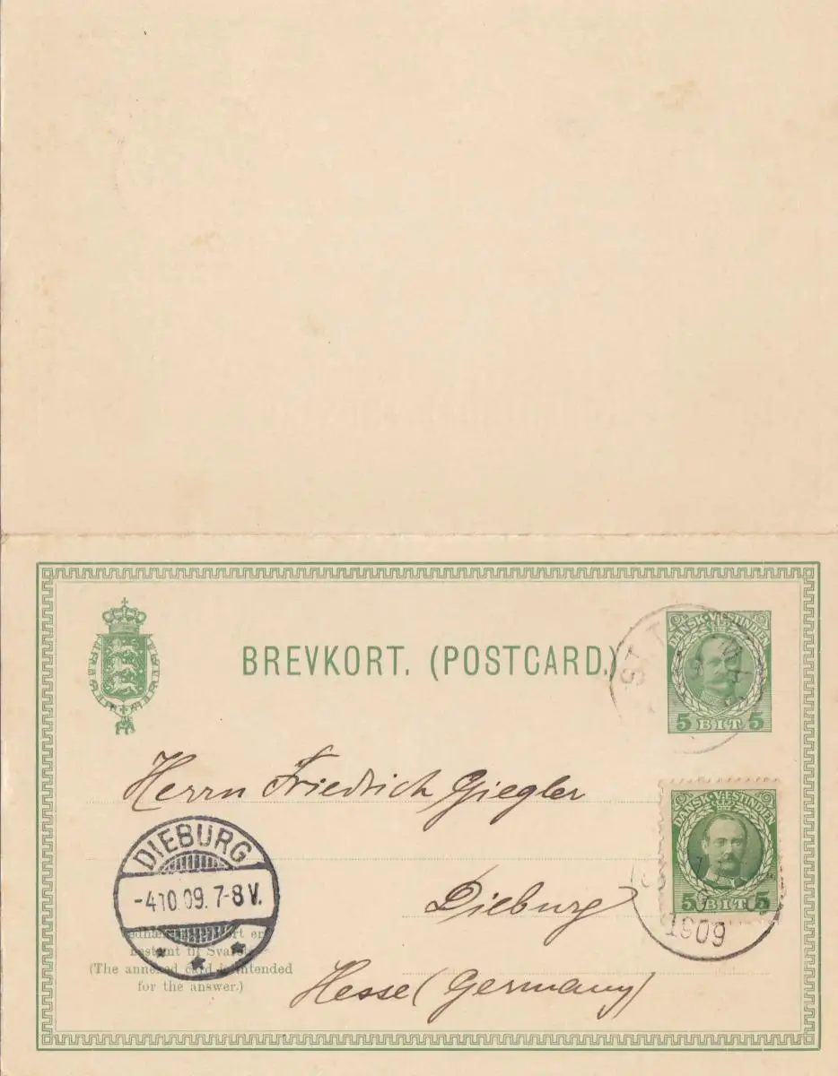 Dansk-Vestindien: post card 1909 St. Thomas to Dieburg/Germany