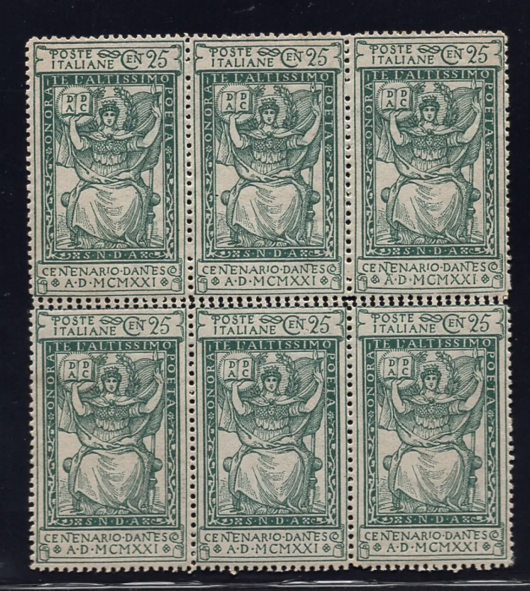MNH - Vollgummi - Dante Cent. 15 grün Nr. 116od Block von sechs Exemplaren mit doppelter horizontaler Verzahnung in der Mitte, neuer perfekter Vollgummi - Ungewöhnlich - Kat. euro 270 Cod. 3339/WEB