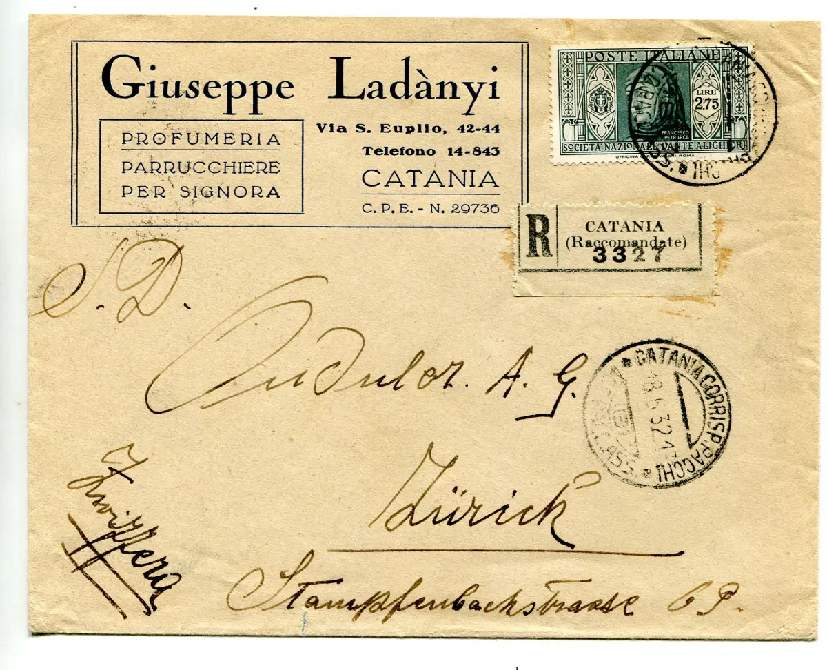 - Dante Lire 2,75 Nr. 312 isoliert auf Umschlag Racc. von Catania nach Zürich am 18.6.32 - Im Tarif - schöne und ungewöhnliche Nr. 185/A