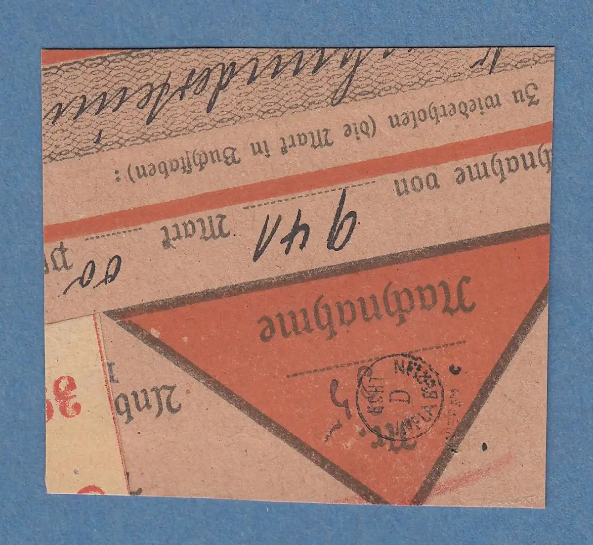 Sauber gestempelt, auf NN-Paketkartenabschnitt haftend. Die Marke befindet sich in einwandfreier gestempelter Erhaltung.