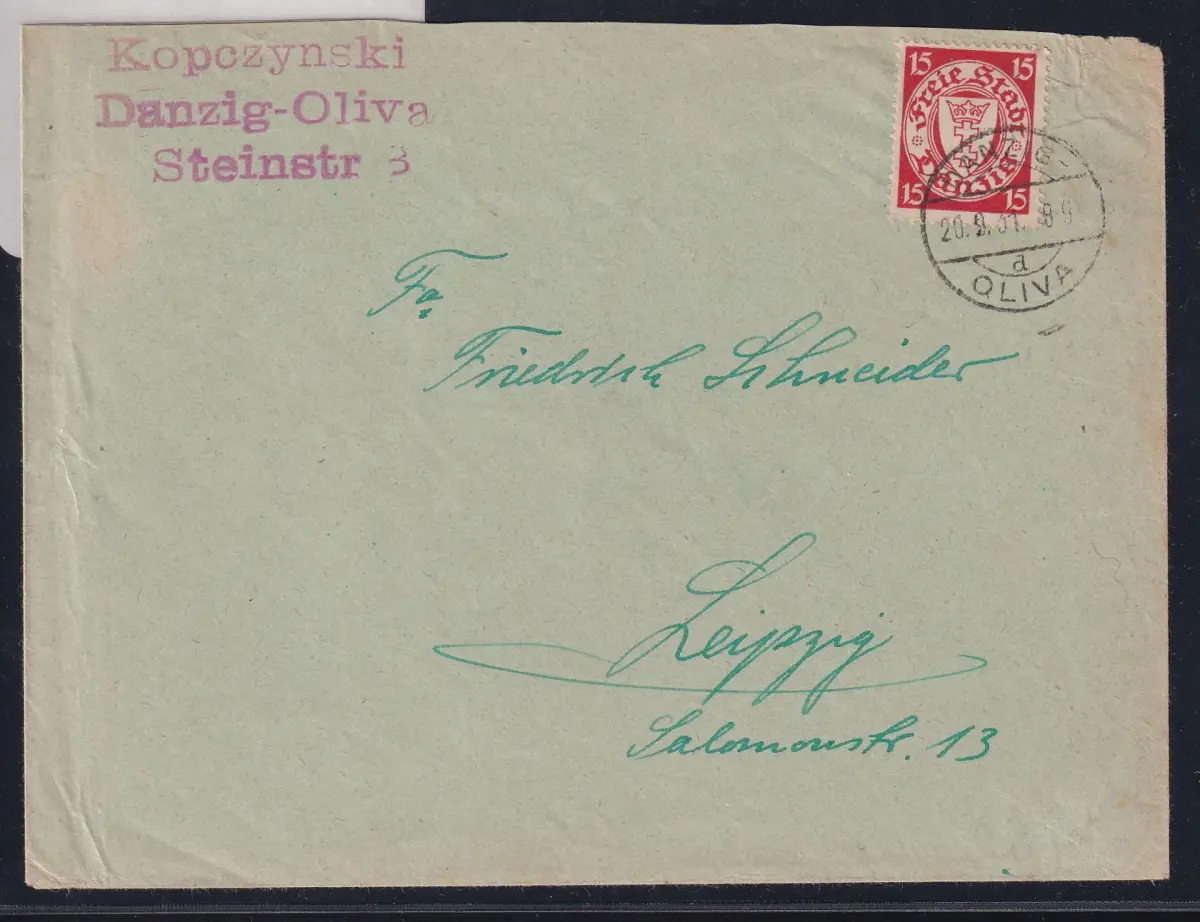 15 Pfennig Freimarken Staatswappen im Oval auf Fernbrief portogerecht am 20.9.1931 von Danzig Oliva nach Leipzig gelaufen.