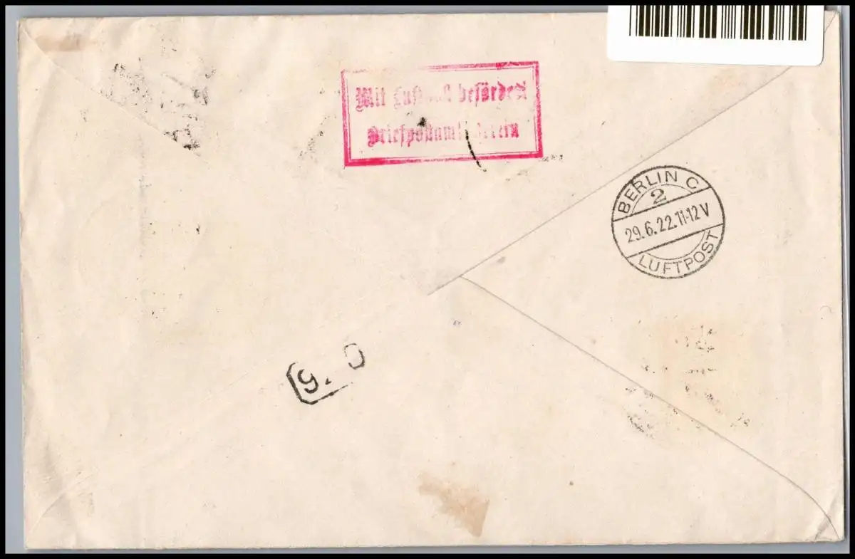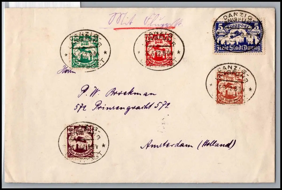 40 Pfennig bis 5 Mark Flugpostmarken als Mischfrankatur auf Luftpostbrief Ausland am 28.6.1922 von Danzig nach Amsterdam Holland gelaufen. Rückseitig roter Luftpostbestätigungsstempel Berlin C 2