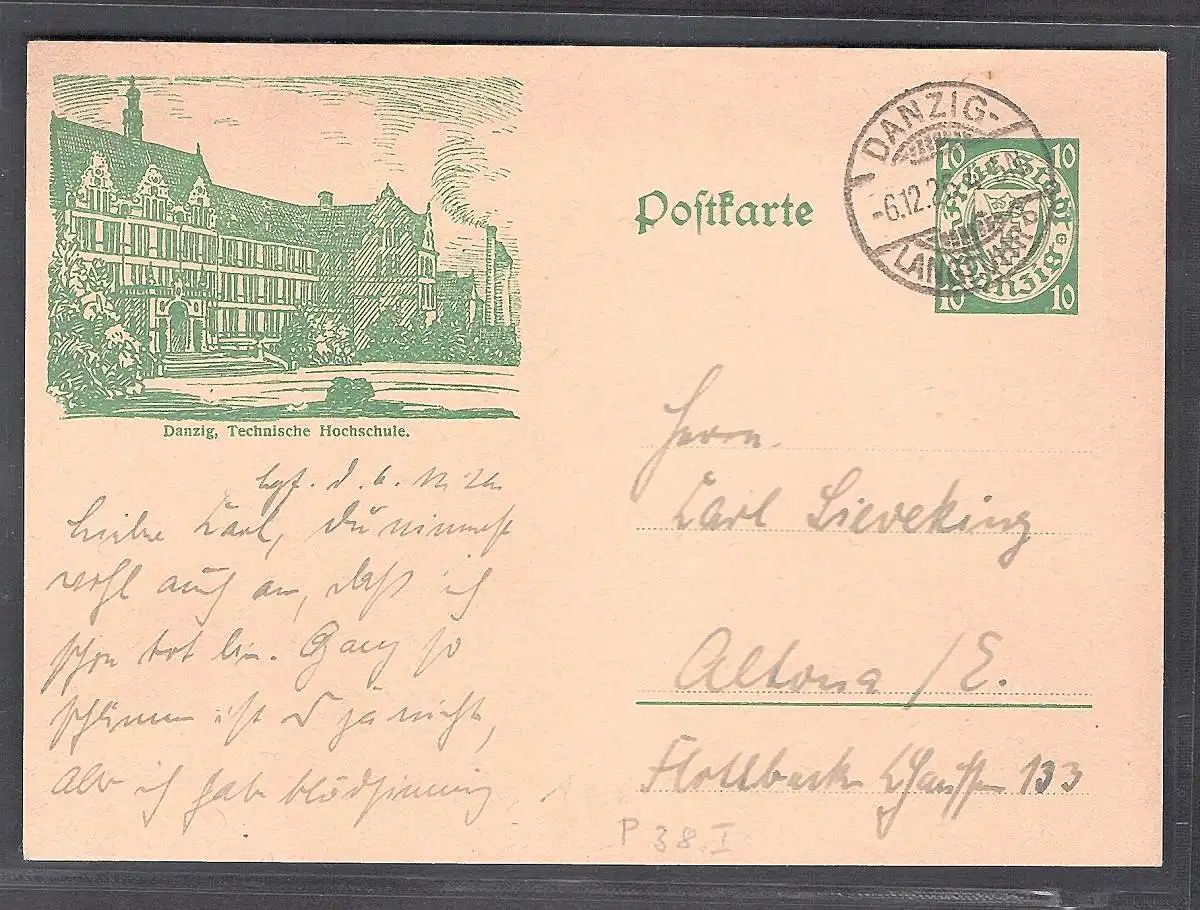 Danzig, Ganzsache Mi.-Nr. P38 I, Technische Hochschule, gestempelt.