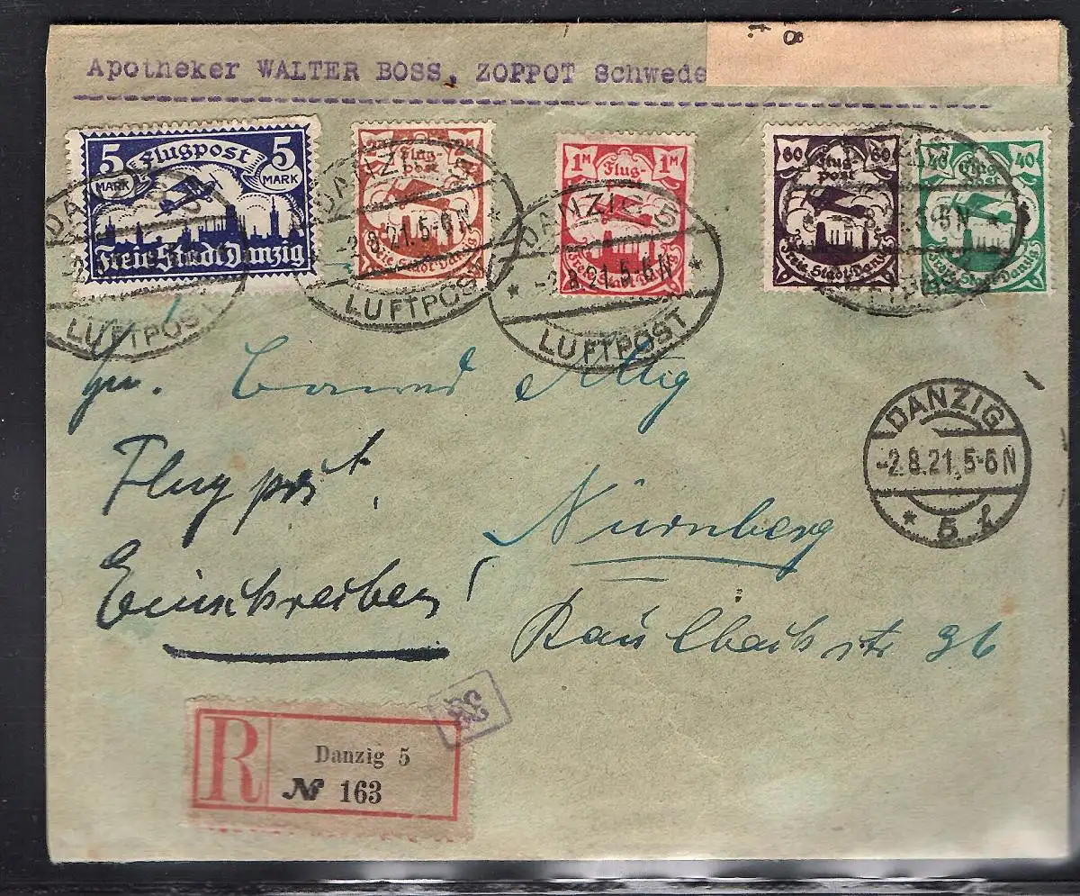 Danzig, R-Luftpost Fernbrief mit Mi.-Nr. 66-70, zensiert.