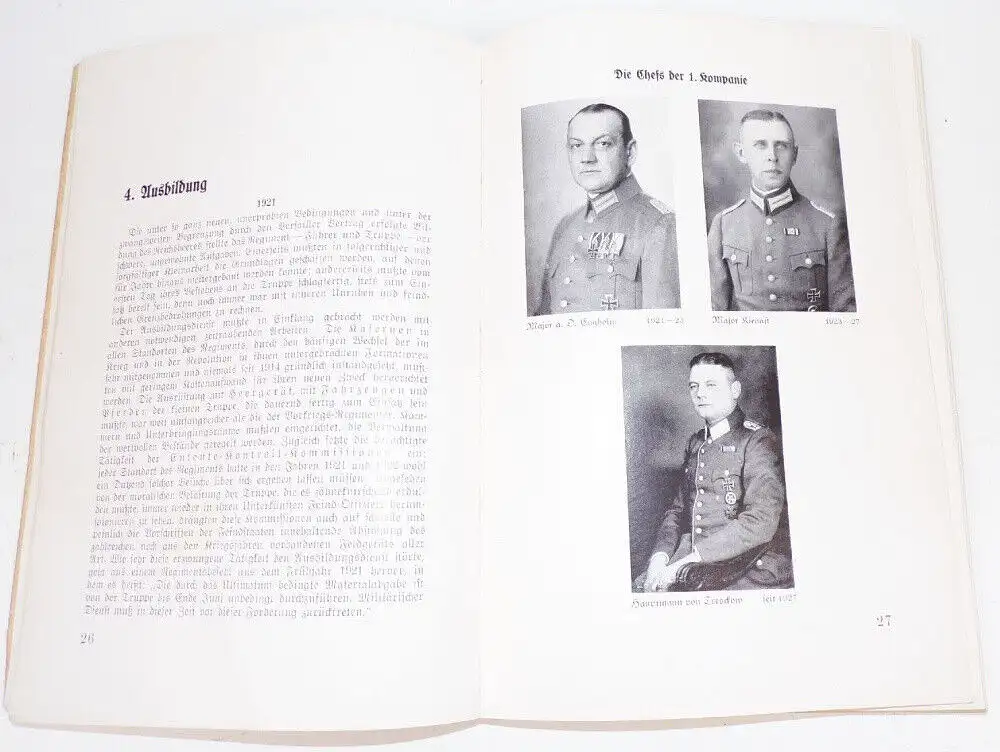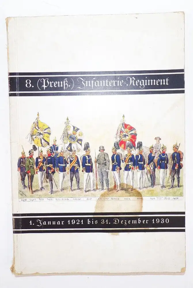 Originales Buch " Das 8 Preußische Infanterie Regiment, vom 1. Januar 1921 bis 31. Dezember 1930. Von Sauer ( Oberleutnant und Adjutant des 8 IR ). Format A 5, zahlreich illustriert, 151 Seiten, Softcover. Erhaltung: außen bestoßen und unsauber, Buchrücken etwas beschabt, anfangs mit einen dunklen, abnehmenden Fleck ( bis Seite 30 ), bis zum dritten Blatt zusätzlich mit einen Einriss ( Seiten klebten dort wohl mal aneinander ), ansonsten gut erhalten. Siehe bitte auch Fotos.