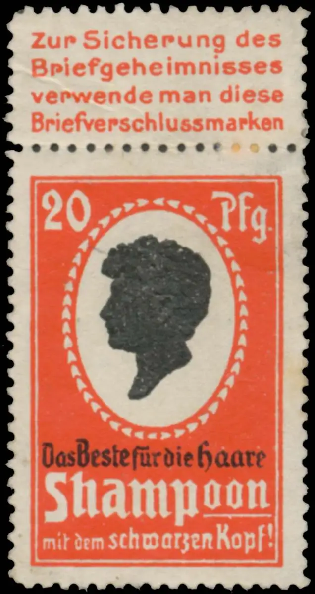 20 Pfg. Shampoon mit dem schwarzen Kopf, Größe/Zustand: 5x2 , guter Zustand, Original alte Reklamemarke die seinerzeit für die Werbung benutzt wurde