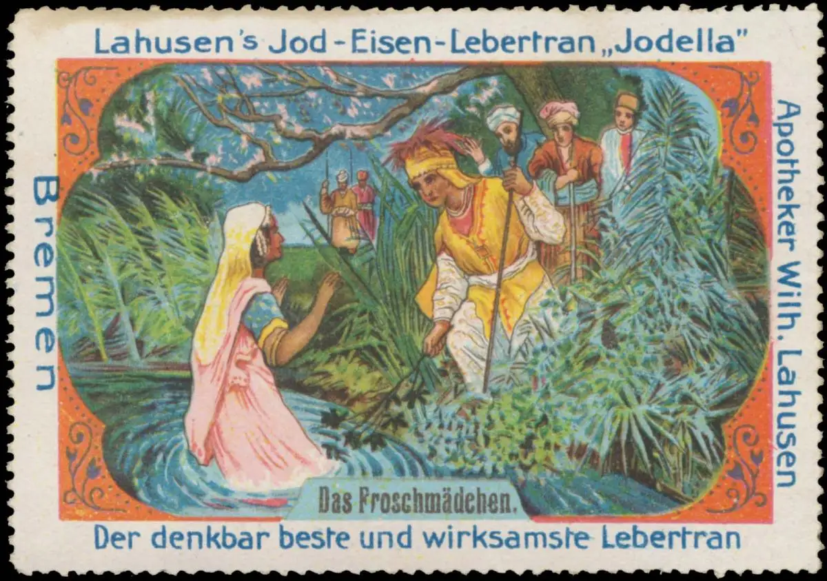 Lahusens Jod-Eisen-Lebertran Jodella, der denkbar beste und wirksamste Lebertran. Märchen, Größe/Zustand: 5x8 , guter Zustand, Original alte Reklamemarke die seinerzeit für die Werbung benutzt wurde