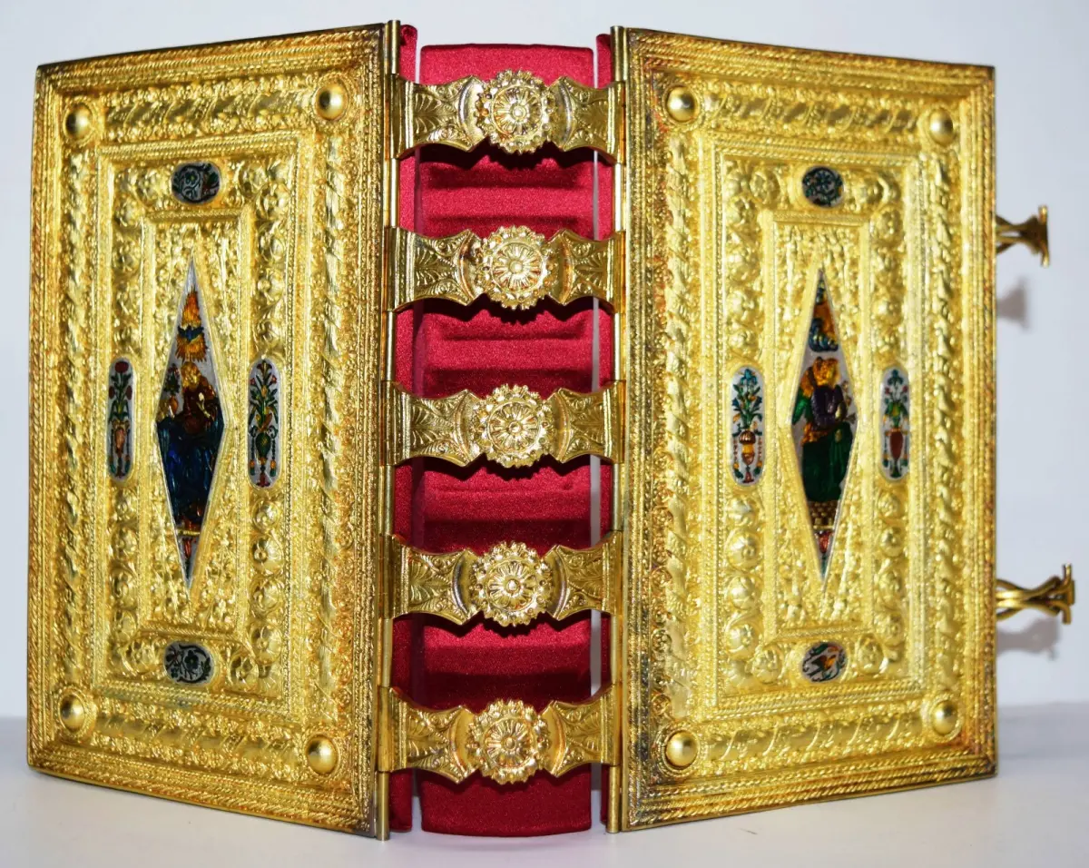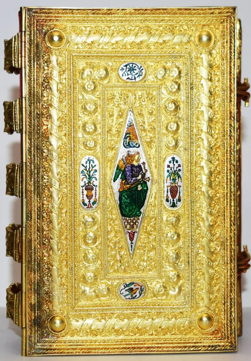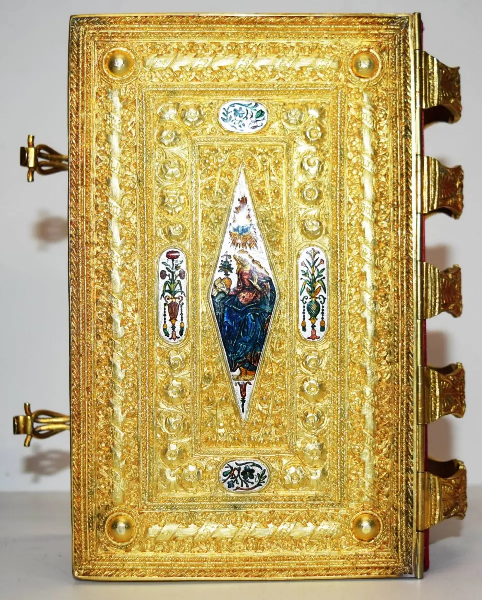 vergoldete Prunkdeckel mit zehn emaillierten Miniaturen, vergoldeten