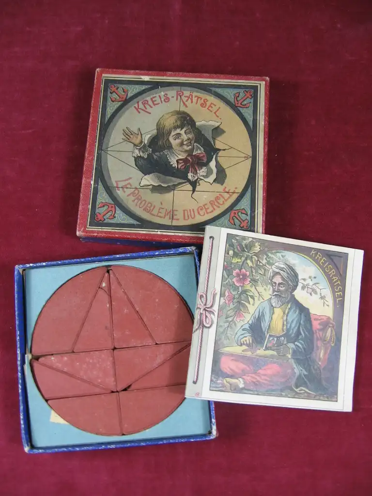 Originalschachtel vom Verlag der Leipziger Lehrmittel-Anstalt mit dem Legespiel "Das Kreisrätsel", bestehend aus 10 Steinen (wie Ankerbausteine). Beiliegend das Heft mit 99 Aufgaben. Größe der Schachtel: 9 x 9 x 1,5 cm.