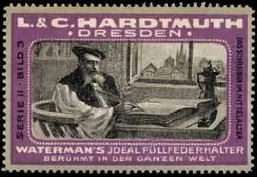 Serie II, Bild 3, Watermans Ideal Füllfederhalter berühmt in der ganzen Welt., Größe/Zustand: 4x6 , guter Zustand, Original alte Reklamemarke die seinerzeit für die Werbung benutzt wurde