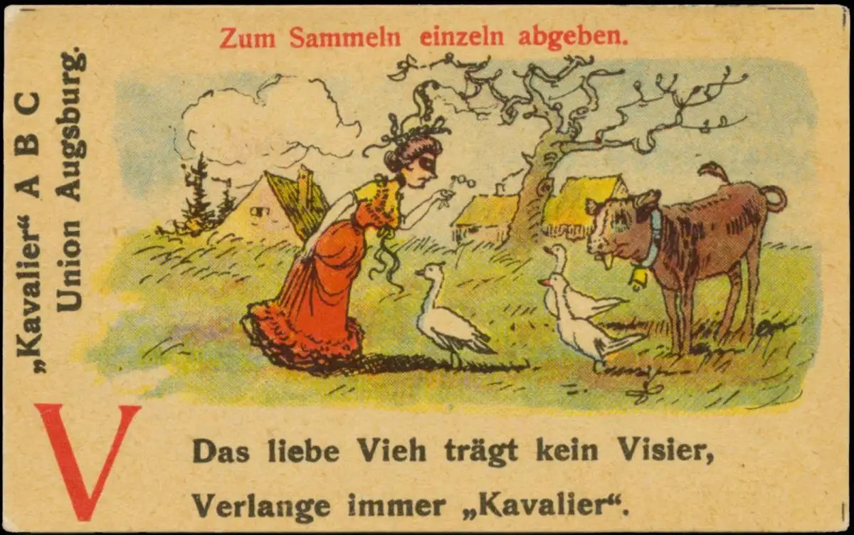 Sammelbild Buchstabe V, vom Kavalier ABC, Rückseite mit Text, Schuhcreme, Schuhputz, Größe/Zustand: 5x9 , guter Zustand, Original alte Reklamemarke die seinerzeit für die Werbung benutzt wurde