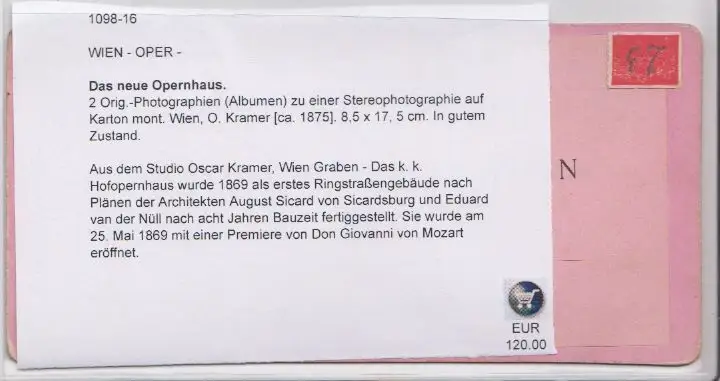 Bemerkungen: Aus dem Studio Oscar Kramer, Wien Graben - Das k. k. Hofopernhaus wurde 1869 als erstes Ringstraßengebäude nach Plänen der Architekten August Sicard von Sicardsburg und Eduard van der Nüll nach acht Jahren Bauzeit fertiggestellt. Sie wurde am 25. Mai 1869 mit einer Premiere von Don Giovanni von Mozart eröffnet.