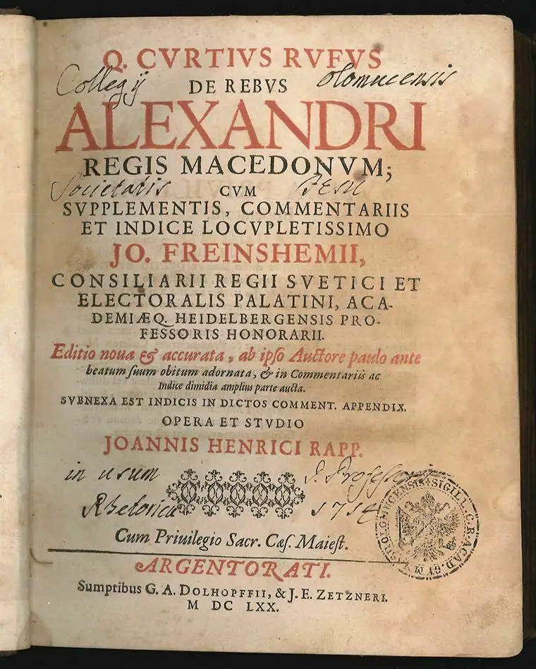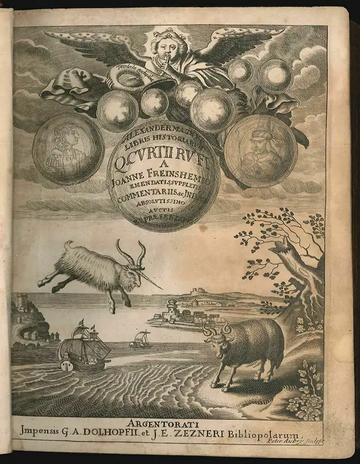 Bemerkungen: VD17 1047174G; Graesse II, 311; Brunet II, 449 - Quintus Curtius Rufus war ein römischer Historiker der Kaiserzeit, der eine beinahe vollständig erhaltene Geschichte Alexanders des Großen in zehn Büchern verfasste. Obwohl die ersten beiden Bücher verlorengegangen sind, ist es dennoch das einzige umfaßendere lateinische Geschichtswerk über Alexander, das mehr oder weniger vollständig überliefert ist. Der erhaltene Teil setzt mit dem Bericht über das Jahr 333 v. Chr. und der Legende vom Gordischen Knoten ein und endet mit dem Tod Alexanders und einem Ausblick auf die Konflikte um seine Nachfolge. Seine Darstellung stützte Curtius vor allem auf die Alexandergeschichte des Kleitarchos.