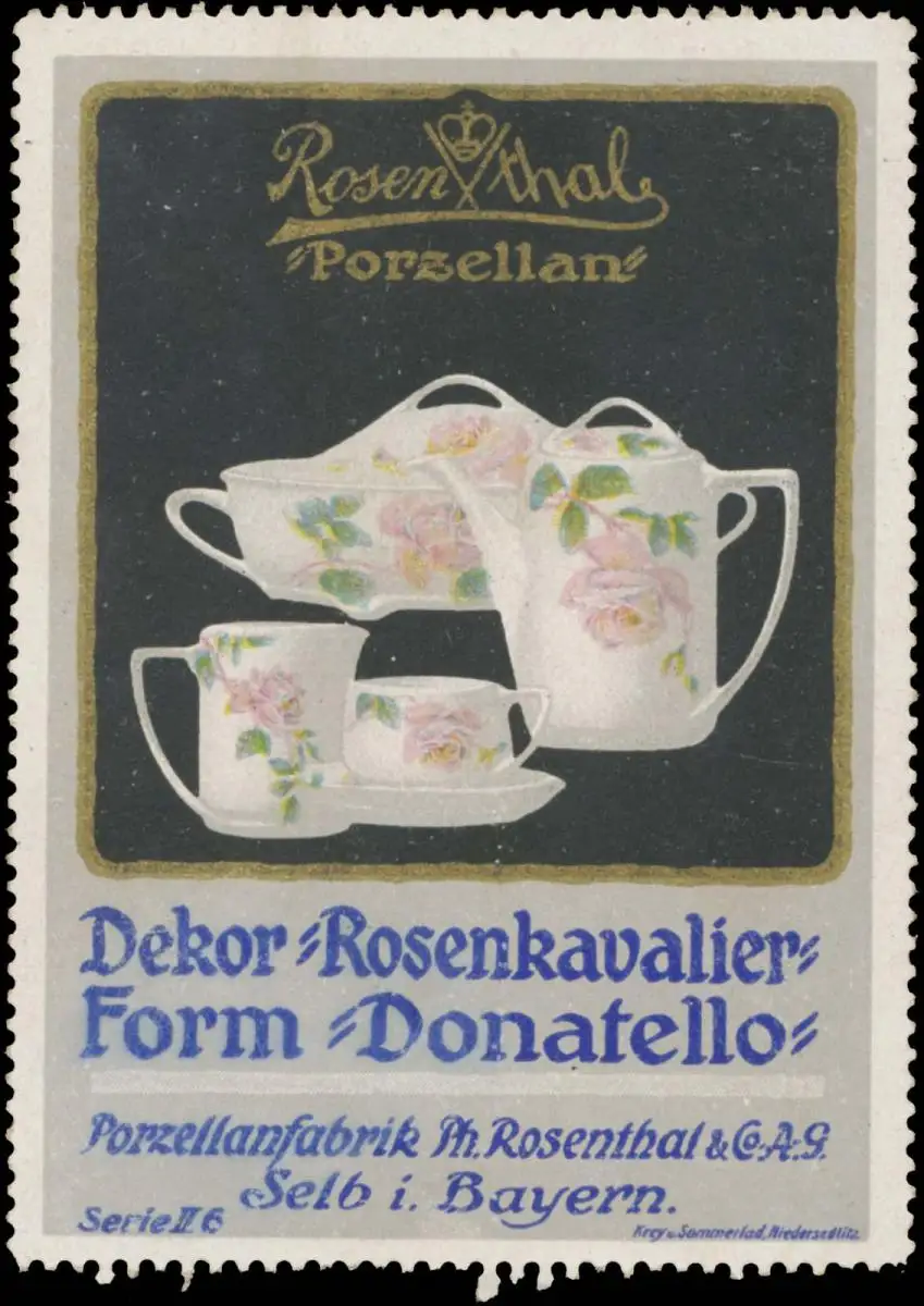 Serie II, 6, Druckerei: Krey und Sommerlad, Niedersedlitz, Rosenthal Porzellan, Größe/Zustand: 8x6 , guter Zustand, Original alte Reklamemarke die seinerzeit für die Werbung benutzt wurde
