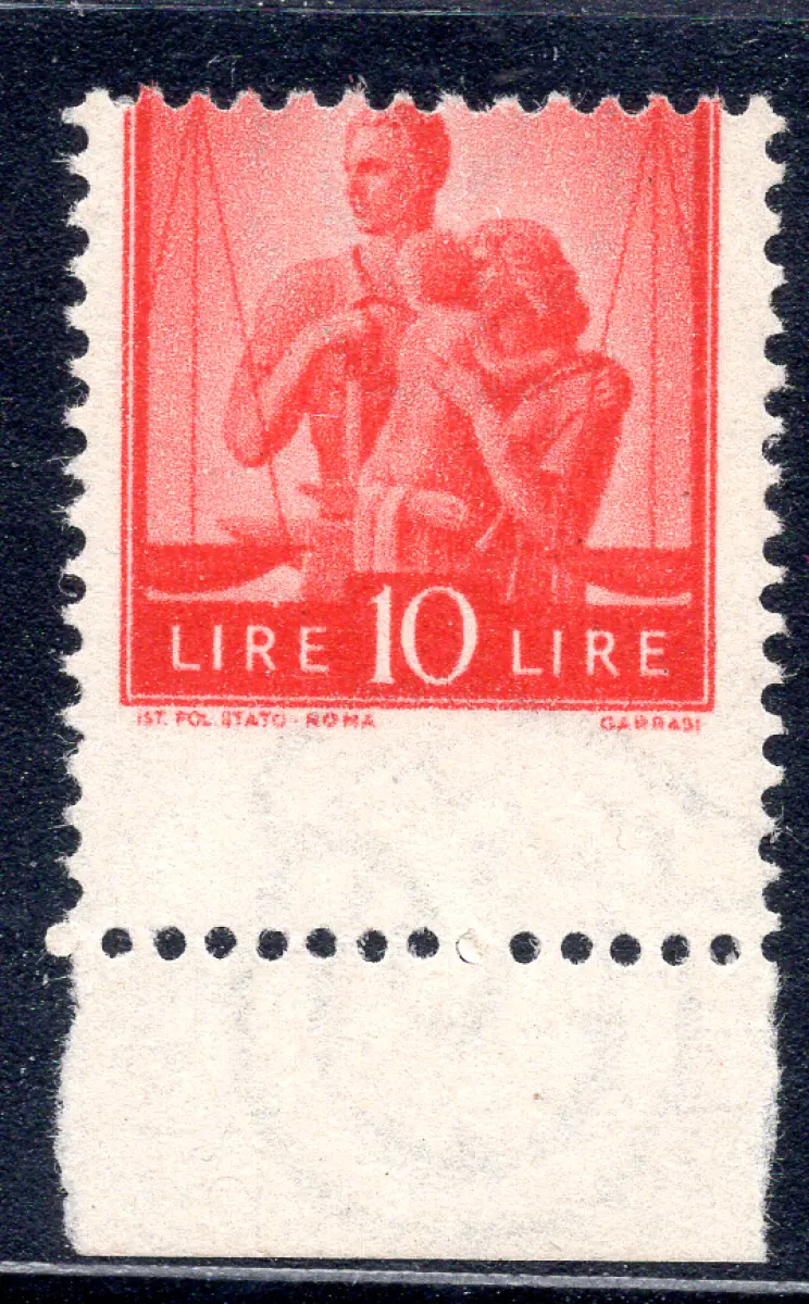 Democratica Lire 10 orange Sorten ohne Vollgummi - Democratica Lire 10 orange. 559u stark verschobene horizontale Verzahnung - Exemplar aus der letzten Reihe des Blattes ohne Schriftzug Poste Italiane - Kat. 125+ Cod. 484/13