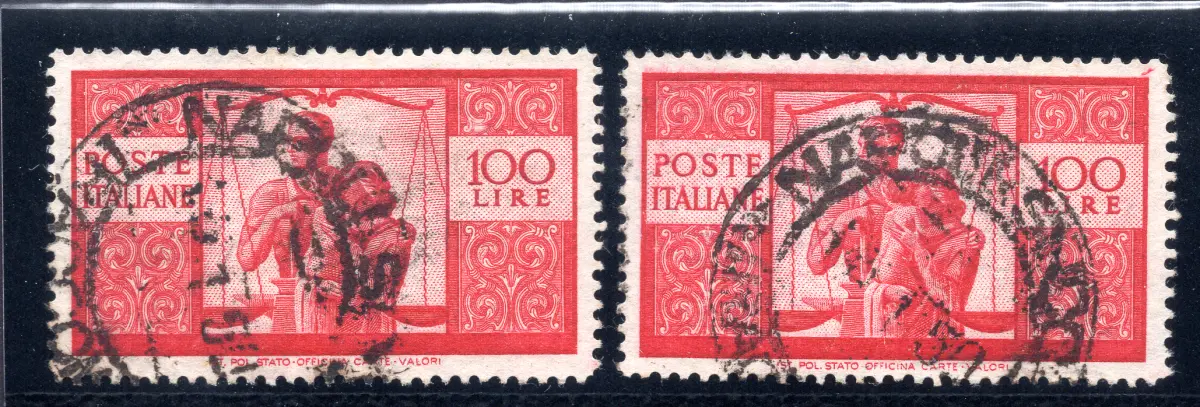 GEBRAUCHT - Democratica Lire 100 Nr. 565 lebendes Karmin, zweite Verzahnungsplatte 14,1/4 weißes Papier zwei Exemplare von ausgezeichneter Qualität und Zentrierung mit den Eigenschaften der Position. 50 und Position. 60 (Sass. spec. n. 25Ac, 25Ad) - Uncommon Cod.554/182