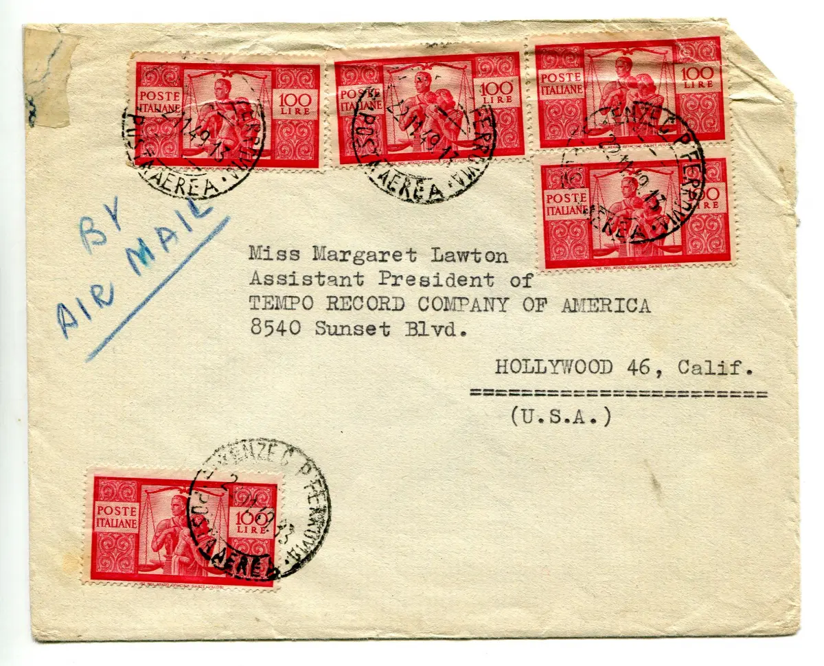 Democratica Lire 100 fünf Exemplare (eines defekt) auf Luftumschlag für die USA (Kalifornien) am 22.11.49 - Preis über 15 Lire Nr. 762/A