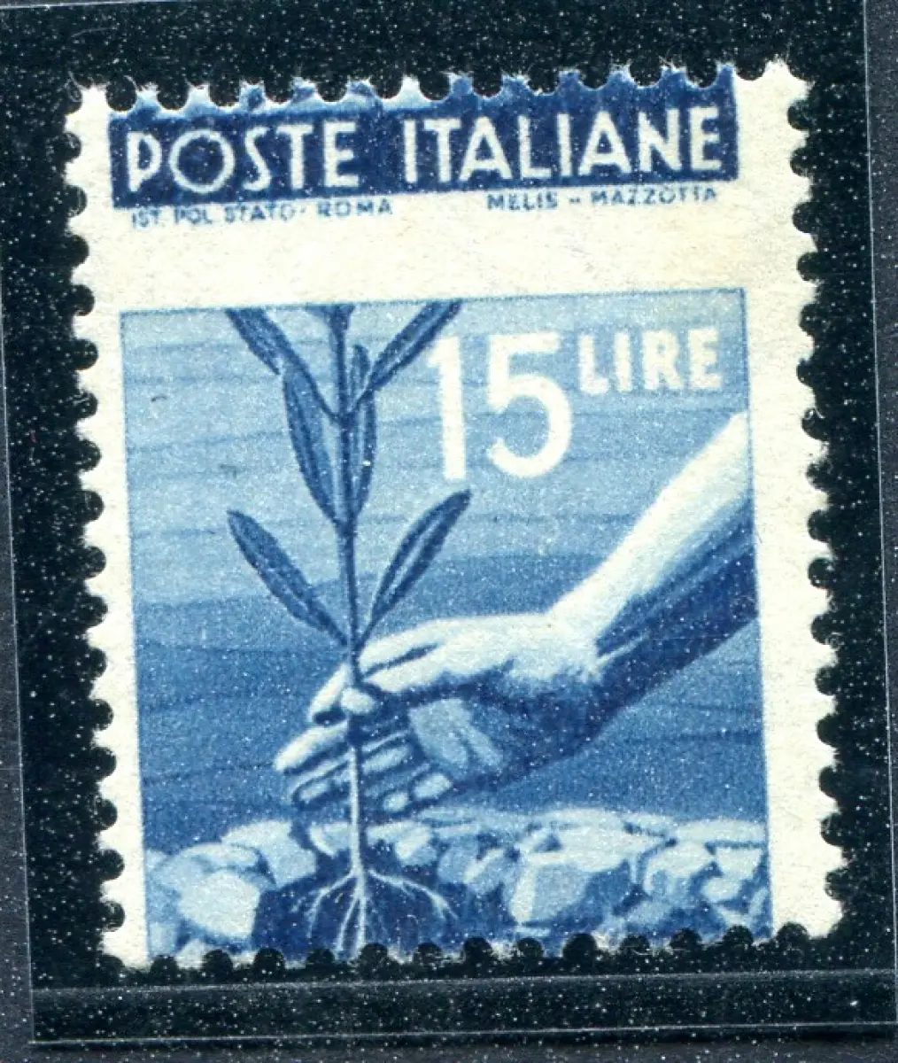 Democratica Lire 15 Sorten stark verschobene Verzahnung Vollgummi (MNH) - Democratica Lire 15 Nr. 560u mit stark vertikal verschobener Verzahnung (Italienische Post oben) - Kat. 85 Code Nr. 645/2