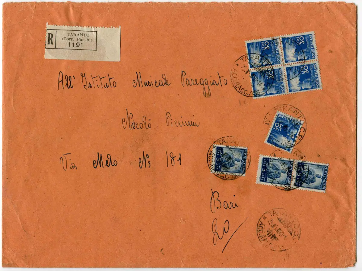 - Democratica Lire 30 Nr. 563 in Quartina + Ergänzungen Nr. 555 x 3 + 563 auf Umschlag Racc. (Großformat) von Taranto nach Bari am 25.5.50 - Sehr wertvolles Viertel von 30 Lire - Gelegenheit Nr. 486/5