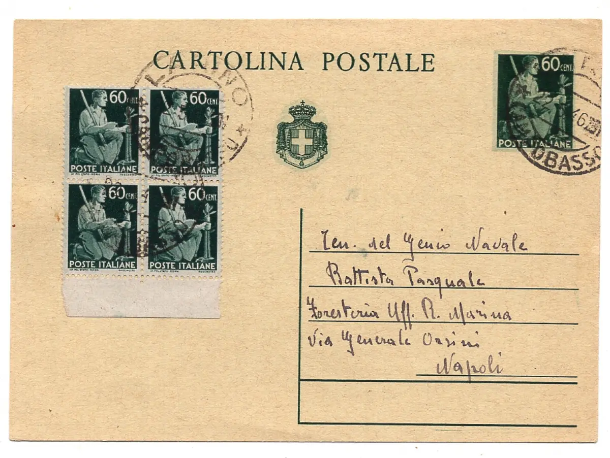Postkarte - Demokratische Cent. 60 Nr. 547 Viertel auf Postkarte Cent. 60 Demokratische mit Wappen (Filagran Nr. C 126), gereist von Larino nach Neapel am 22.5.46 - Seltene Verwendung in der Zeit Umberto II. Cod. 3226/WEB